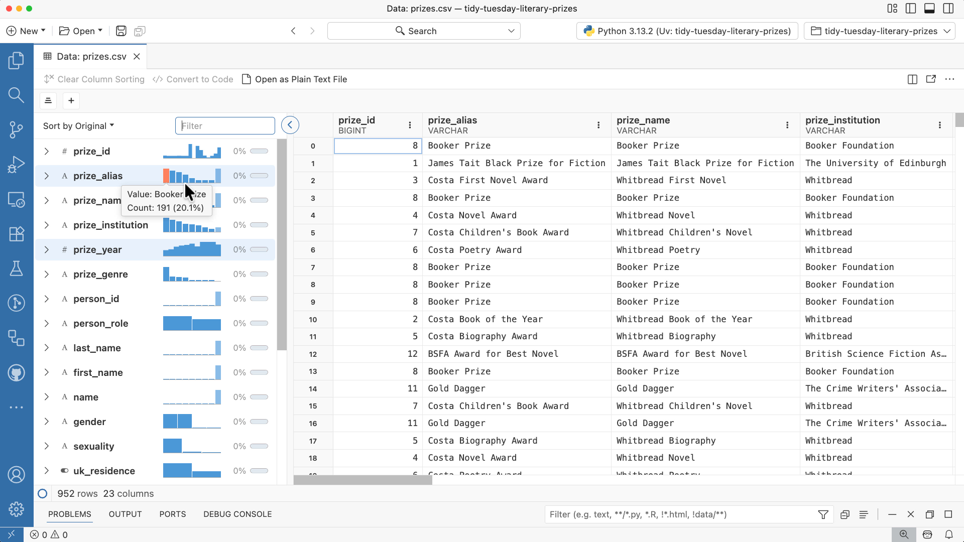 Explore #TidyTuesday literary prizes with Positron’s Data Explorer
